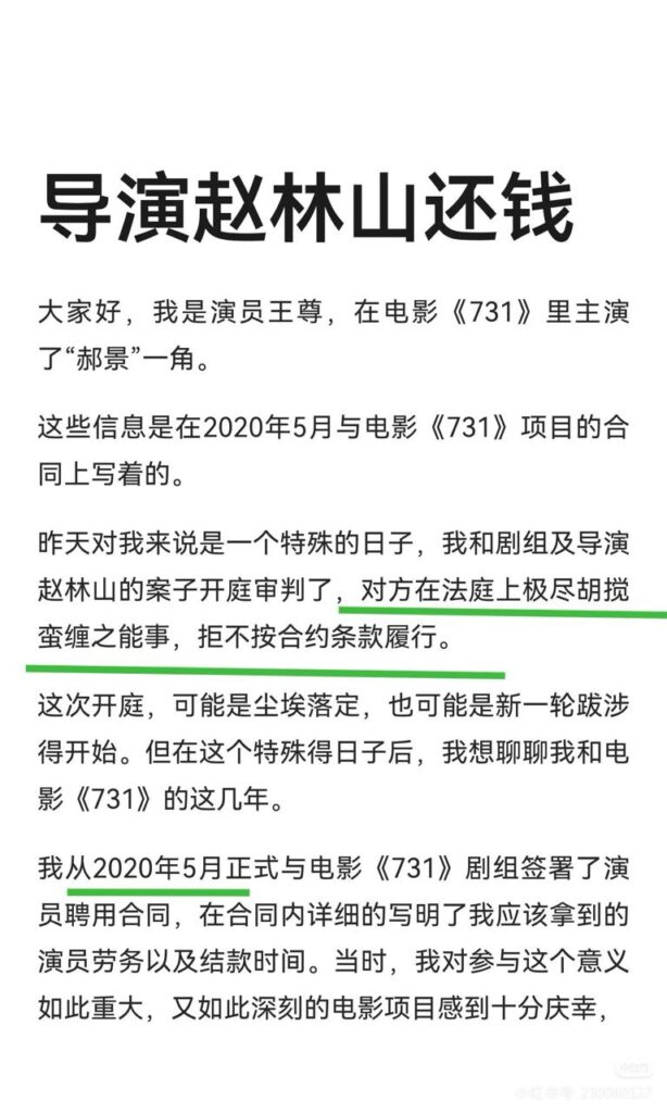 内地电影《731》演员王尊,突然发文指责《731》剧组多次欠薪,其本人声称,在电影拍摄阶段,剧组曾多次遇到停工以及资金问题,是他始终支持导演赵林山完成这部电影,没想到换来的却是被除名以及高达70万元的薪资欠款。