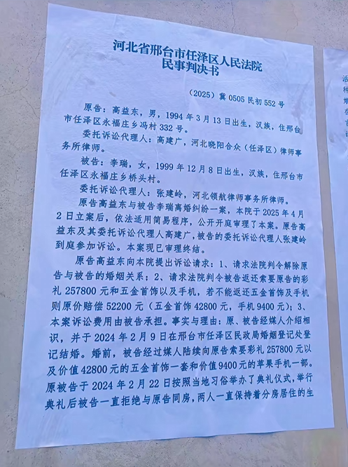 河北邢台任泽区桥头村骗婚事件登顶互联网热搜,一名男子为结婚支付了32万元彩礼,然而婚后妻子竟未曾在夫家住过一天,以各种理由回到自己老家居住,拒绝与丈夫见面。
