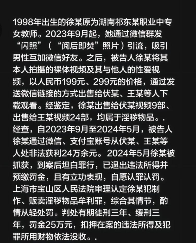湖南祁东炸裂大瓜,95后中专女教师徐佳莹突然被批捕判罚缓刑,年仅28岁的职校女教师,竟然私下里拍摄大量不雅视频售卖,不到一年事件狂捞24万,别的福利姬都是假扮教师贴近,您是真教师下海啊?