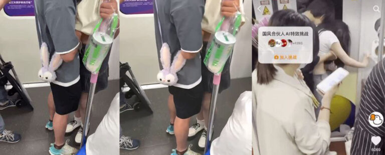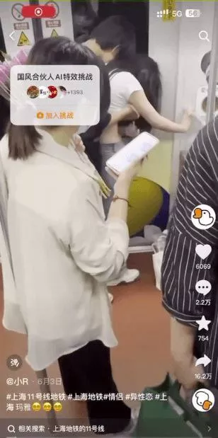 情侣之间的play方式又有新花样了吗?在上海地铁11号线上,一对年轻情侣居然在拥挤的车厢中公然展开亲密行为,男子把手伸进女子的上衣,当众开始摸扔表演,令人惊讶不已。他们似乎觉得地铁的环境限制了他们的表达方式。